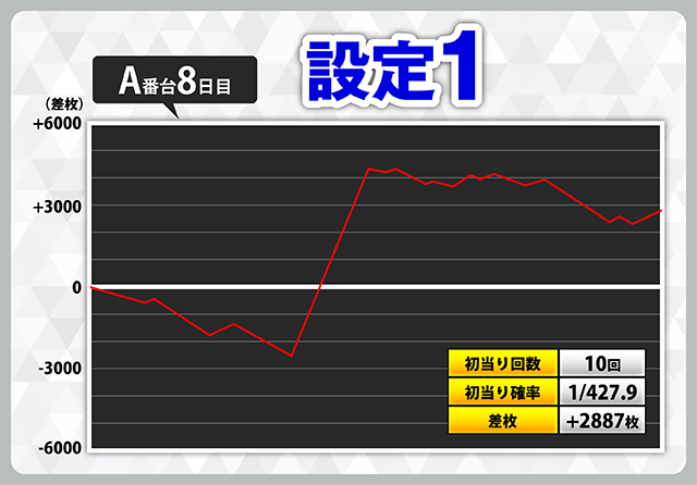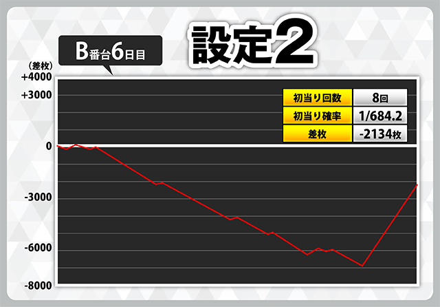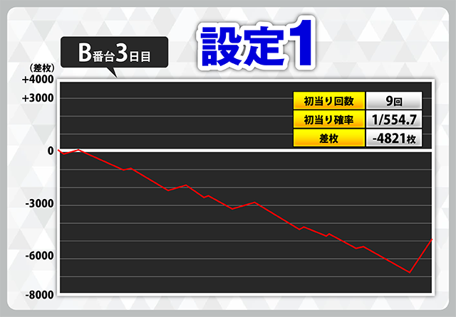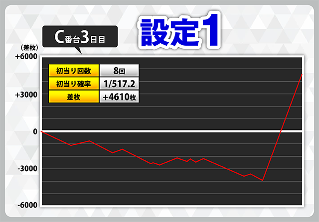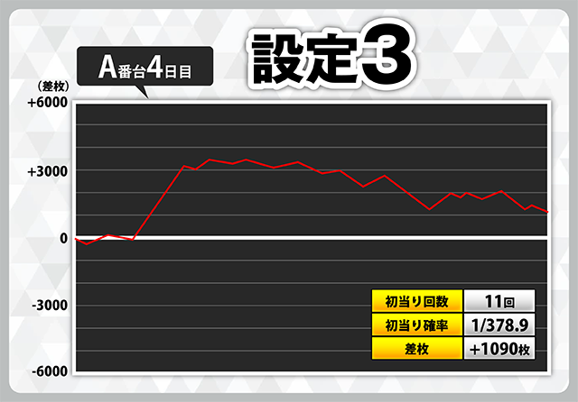 | 3 | +8886枚(設定1) | −6920枚(設定2) |