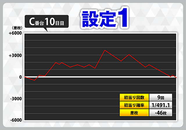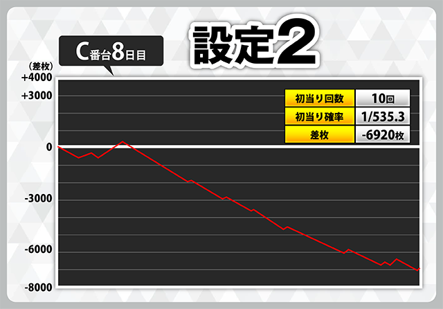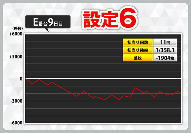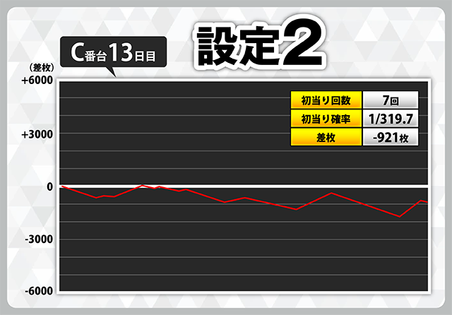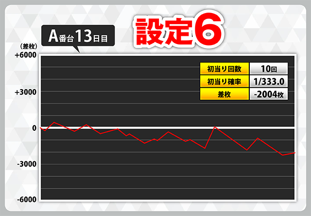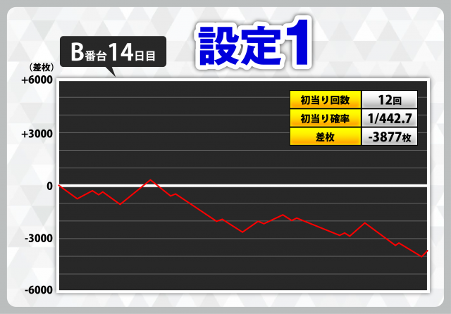 しかし、14日目のC番台(設定6)のように7000枚近くもマイナスになり、初当りも差枚も設定6を全く感じさせないまま一日が終わってしまうということもあります。