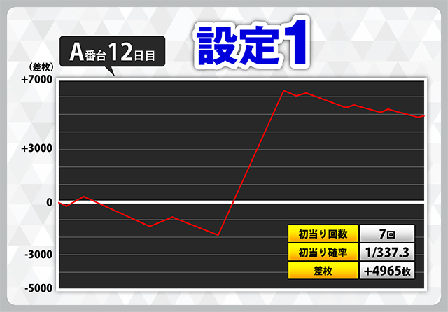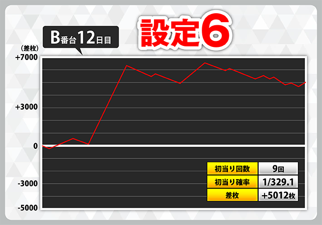 12日目のA番台(設定1)とB番台(設定6)のスランプグラフを見てください。同じようなグラフを描き、同じような初当り確率で、同じような出玉を獲得していますが、設定は1と6です。