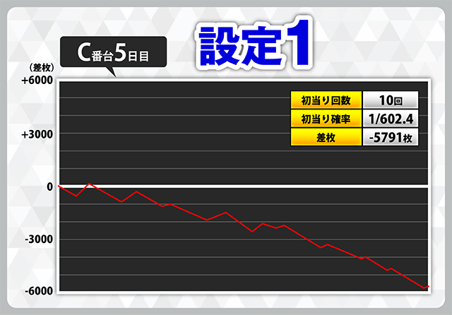 特に2日目のA番台(設定1)や、5日目のC番台(設定2)などは、1日通してまったくいいところがないまま約6000枚のマイナスと、低設定の厳しさが浮き彫りになっています。