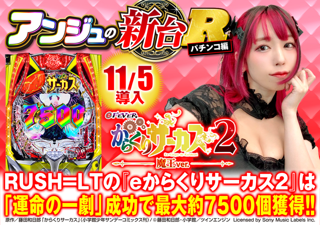 兄弟機となるP機『Pフィーバーからくりサーカス2 運命ver.』も同時にリリースされます。大当り確率1/319.7のミドルタイプで、 初当り時の75%でロングST「超悪魔RUSH」に突入します。超悪魔RUSHの継続率は約75%。右打ち時は大当りの34%が約3000〜7500個を獲得できますので、e機に負けず劣らずの爆発力を備えているといえるでしょう。