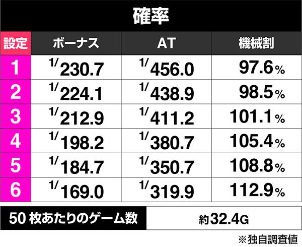 ■ボーナス&AT初当り確率…ボーナスは1/230.7~1/169.0、ATは1/456.0~1/319.9。AT突入契機のメインはボーナスからなので、ボーナス確率1/200以上を高設定のボーダーラインとしましょう。