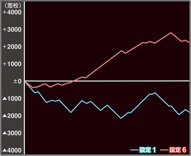 お次はスランプグラフです。今回は設定1と6を実戦しています。グラフ化して見ると一目瞭然! 設定の高低がそのままグラフにも表れております。