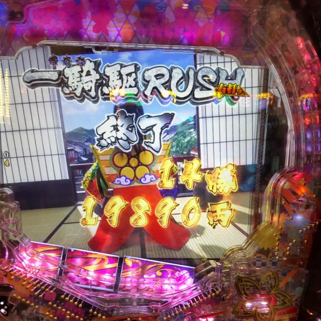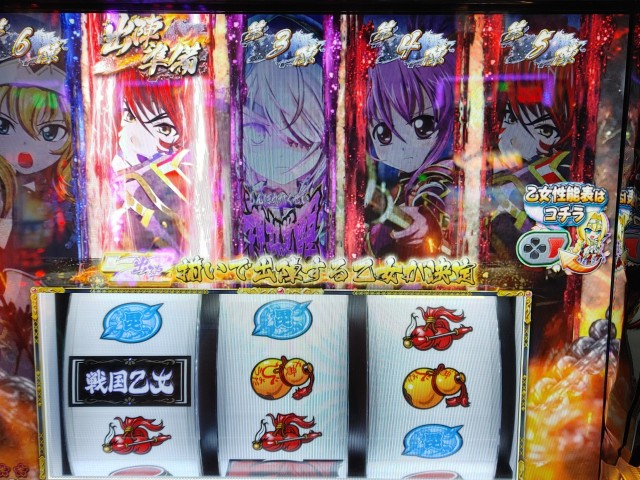戦国乙女が好きな私は開店待ちのBGMに戦国乙女の曲が流れただけで狙い台を変更して『戦国乙女4 戦乱に閃く炯眼の軍師』の島へ。すると台のヤル気は絶好調。何も引かずにオウガイバトルでカンスケちゃんが勝つ勝つ勝つ。10連勝を何回やっても出来なかったのにその日は人生最大の36戦で過去最大上乗せ達成、無事に万枚も突破。