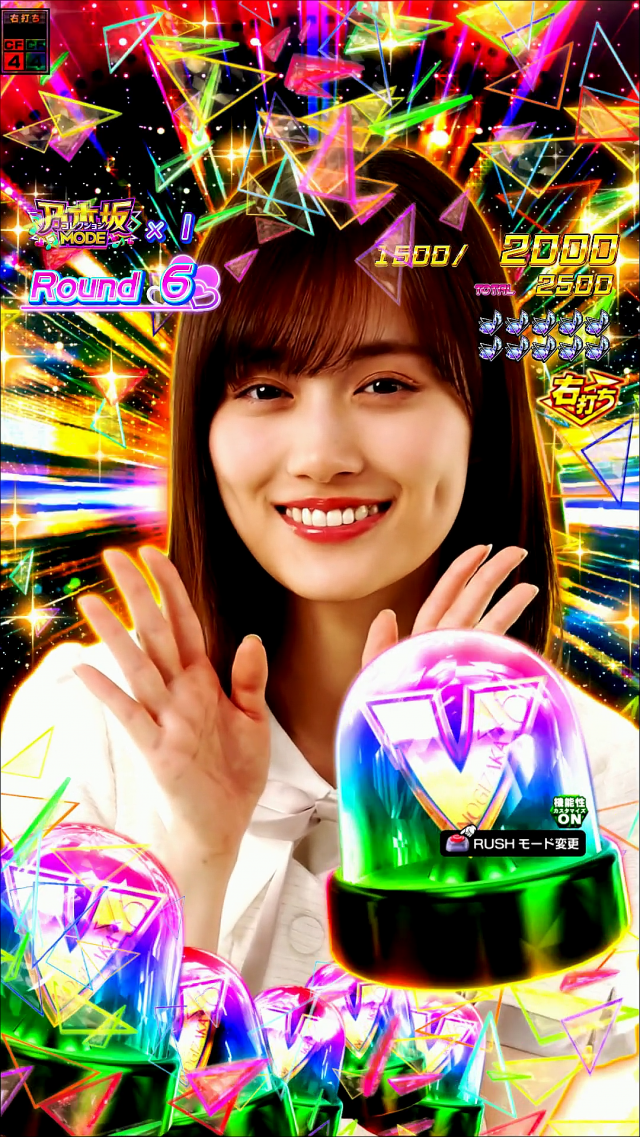 乃木坂RUSHでは1回転で即座に大当りのBATTLE BONUSが得られ、ラウンド中の演出成功で超乃木坂RUSHにモードアップ。失敗すると出玉ゲット後は通常時に引き返してしまう。