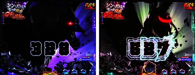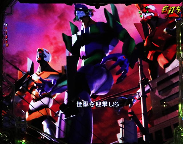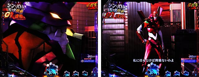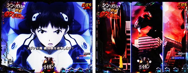 バトルはエヴァの攻撃がヒットすれば勝利=大当り。怪獣の攻撃がヒットした場合は立ち上がり演出が発生し、復活大当りか転落のどちらかが決定します。先述したとおり零号機か2号機と合流していれば大チャンスで、その場合は先に仲間が怪獣とバトルして、怪獣にやられた場合は初号機のバトルに移行。チャンスが2回になるということですね♪