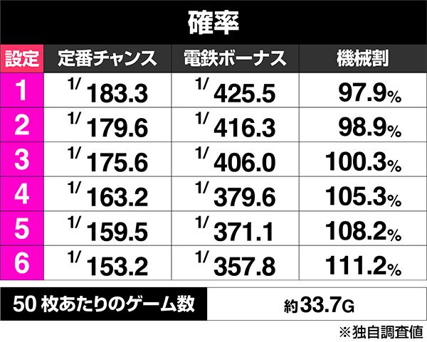 | 電鉄ボーナス回数・出現率 | 6回(1/394.5) |