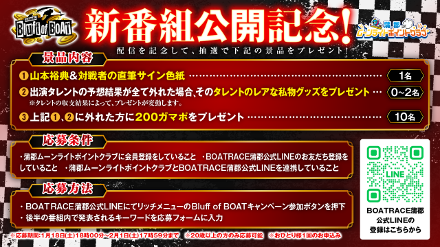 無料配信は、ボートレース蒲郡公式Youtubeチャンネルにて1月18日(土)18時00分〜公開となります。