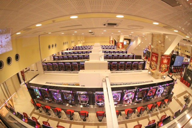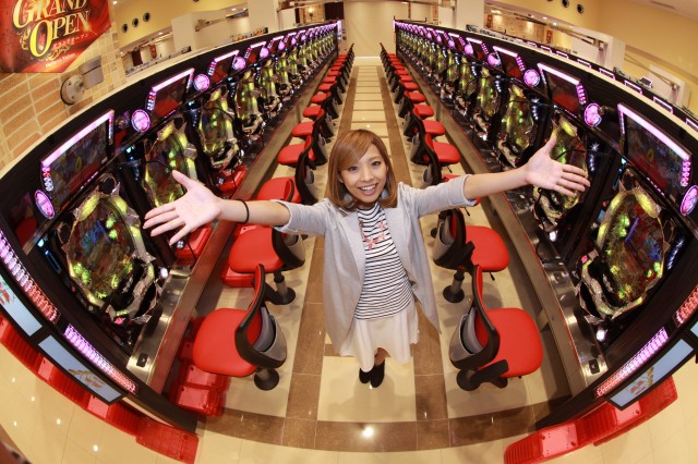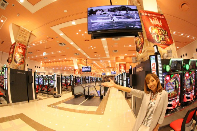 これにはさすがの「ゆずっきー」も驚いたようだ。 店内に入るとカウンター前には、いつぞや見かけたようなテラコッタタイルが敷き詰められ、天井高や島間もかなり余裕がある。 台間には分煙ボードが配され、島間の通路脇や天井には大型のデジタルサイネージが設置されるなど、インフォメーションもバッチリのようだ。