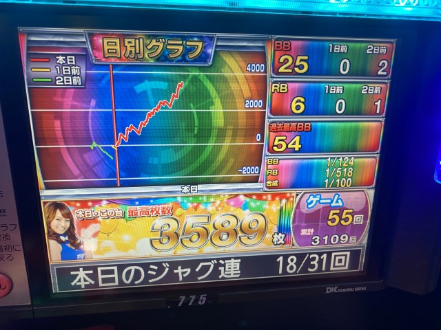 勢いが全く衰えず3500枚超えのホームラン。ただ、相変わらずREGは足りてなくて設定判別が全く捗らず。結局この日は移動があったので、ここでヤメることになりました。最後まで挙動が見たかったなぁ。