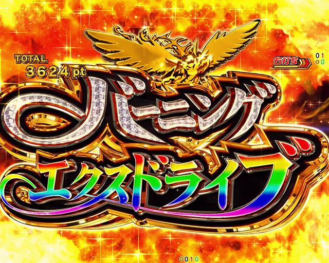 本機唯一のRUSHにして、ラッキートリガー。継続率が約81%もあり、大当り出玉は最低でも1500個。約半数が3000個大当り「SPECIAL絶唱FEVER 3000」で、さらに約5%が下記の「バーニングエクスドライブ」となります。