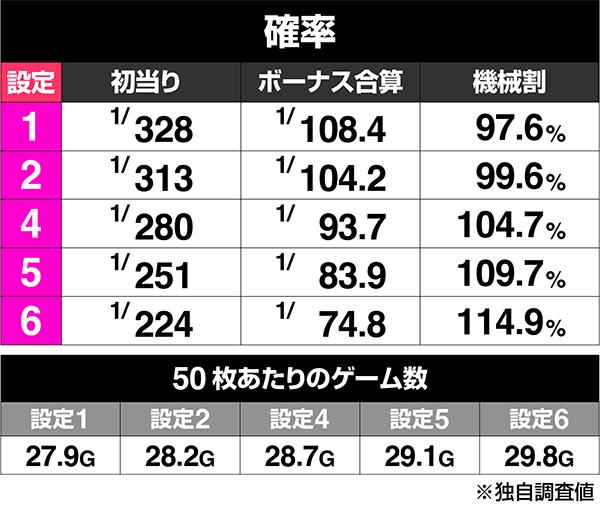 また、50枚あたりのゲーム数についても若干の設定差が存在する。あくまで参考程度だが、初当り確率とあわせてチェックするのがオススメだ。