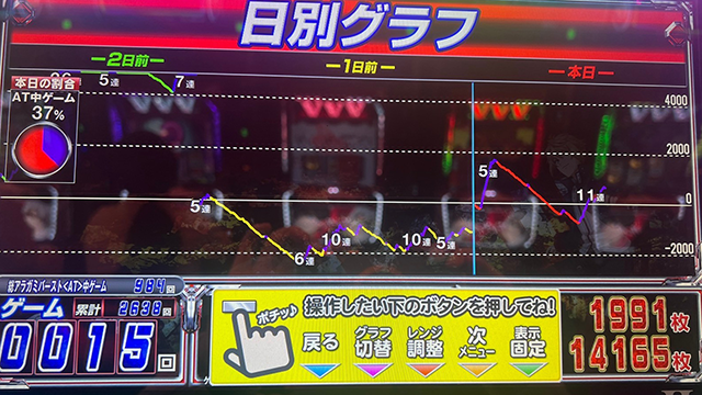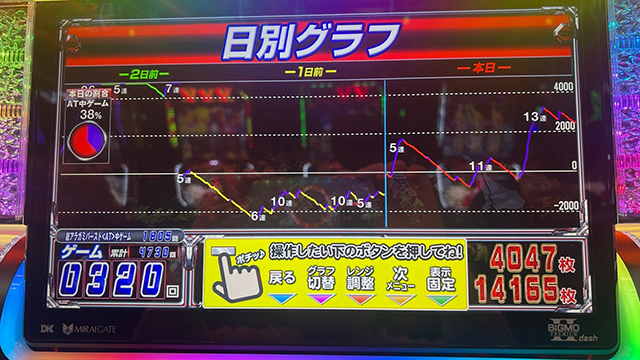 お昼を過ぎて、現在約3500Gほど消化したところ。朝イチの出玉は一度飲まれてしまいましたが、4回目のSTをしっかり伸ばし、なんとか約1500枚弱の持ちメダルを確保。