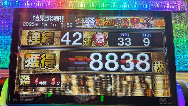 約4時間ものあいだ、止まることなく42連チャン達成! 8388枚を獲得し、気がつけば『チバリヨ2』での出玉は万枚オーバー!