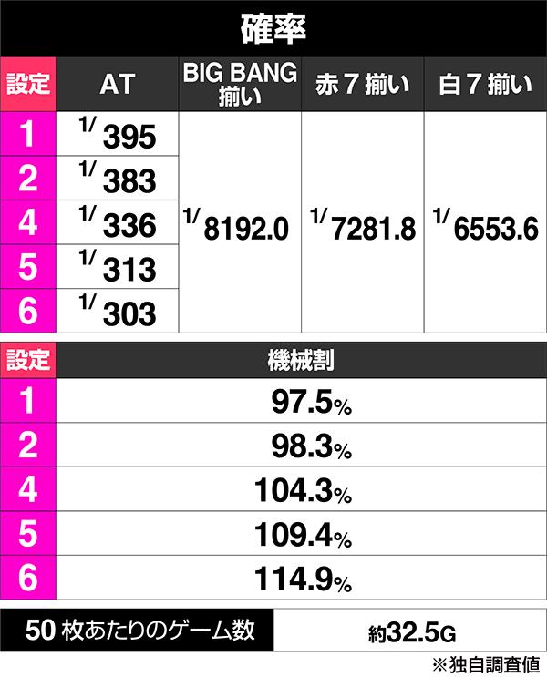 なお、確定役の確率は初当り確率の右に記載している通り。BIG BANG揃いは1/8192.0となっており、ココに関しては不変。引けば一発逆転や出玉促進もありえるプレミアム役となっている。