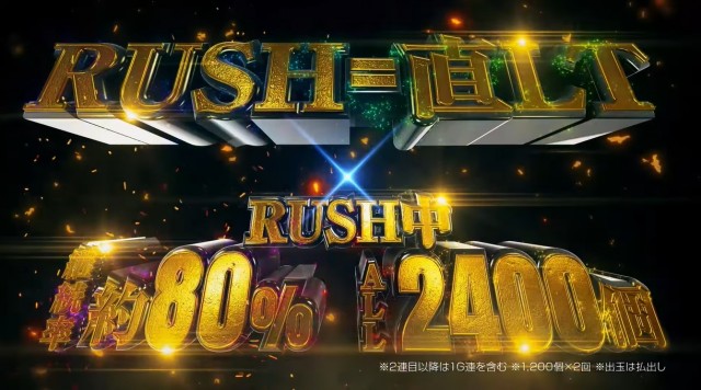 注目ポイントはなんといってもRUSH中の性能で、出玉はオール2400個大当り(1200個✕2回)、その継続率は約80%を誇る。