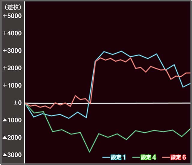 設定に忠実なグラフを描くか? と言われるとそうでもなさそうなので、マイナス差枚でも初当りが軽くずっとモミモミしている台は狙ってみるのもありかもしれません。