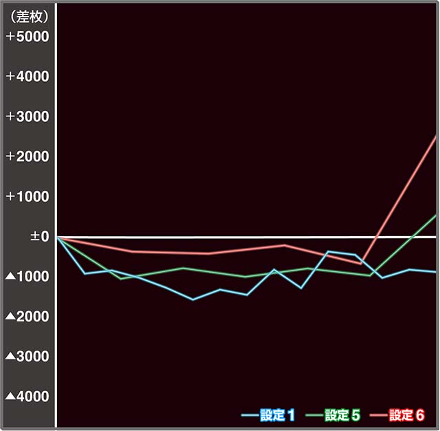 今回は全部で3本の実戦データを採取しましたが、最終的に設定5と6はプラス差枚でフィニッシュし、マイナスで終えた設定1もそこまで大きく負けていません。