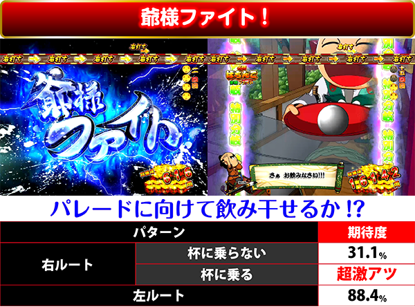 ルート分岐と杯に玉が乗るかが注目のポイント。左ルートは激アツだ。
