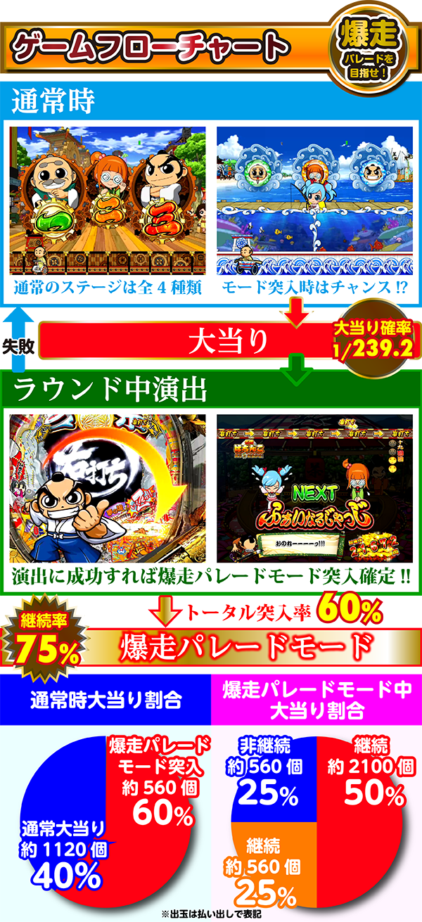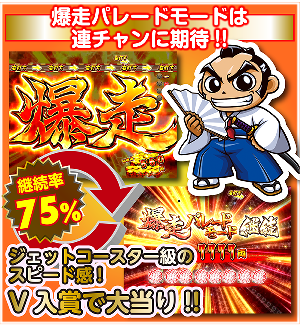 爆走パレードモード中は出玉2100個の大当りなら問答無用で継続確定。560個の大当りの場合は継続率が50%とスリリングな展開となる。またV入賞で大当りとなるためスピード感も抜群。2100個の大当りにかたよれば一撃大量出玉にも期待できる。