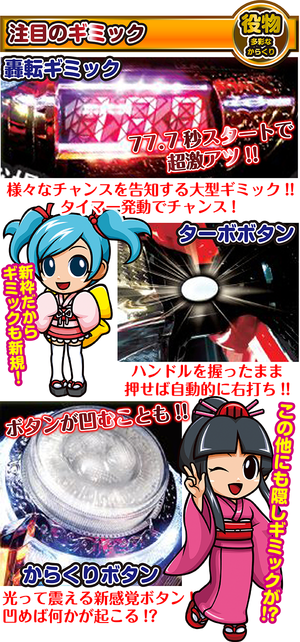 また、楽々右打ちをおこなえる「ターボボタン」や光って震えて凹む「からくりボタン」といった新感覚のボタンも充実。