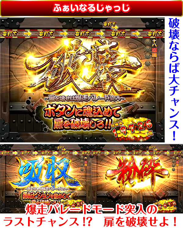 三・七図柄揃いは爆走パレードモード確定、それ以外の図柄揃いは「名機ぱちんこボーナス」となり、ラウンド中の演出で爆走パレードモード突入の成否を告知。また、各種演出に失敗しても「ふぁいなるじゃっじ」に成功すれば爆走パレードモード突入確定となる。このふぁいなるじゃっじには複数のパターンがあり、文字の色が赤ならチャンス、鷹柄なら激アツとなる。
