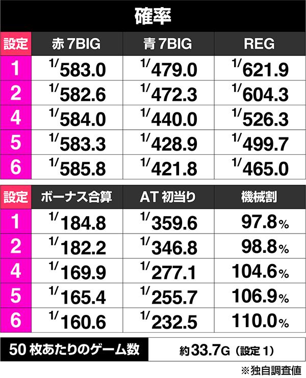 | 設定 | チャンス目+赤7BIG | チャンス目+青7BIG | キラめき目+青7BIG |