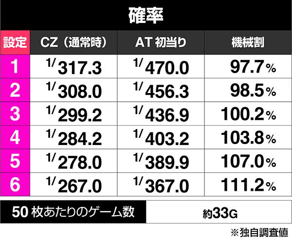 スペックとしては昨今のAT機と比較して突き抜けた機械割ではないが、それでも設定6は111.2%となっており、高設定を狙う価値はおおいにある。