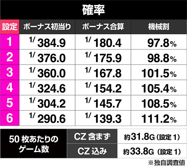 機械割においては昨今のAT機のように114.9%まで達している機種ではなく、設定6においては111.2%だが、設定5でも108.5%をマーク。高設定域の期待値として十分な機種と言えよう。