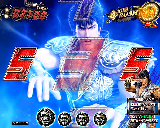 ジャギやリンは「ボタン連打」、ケンシロウや無法者は「中図柄停止」など、選択したキャラによって演出が異なります。