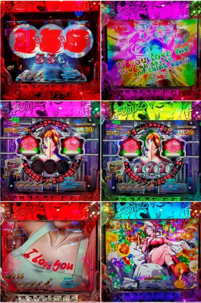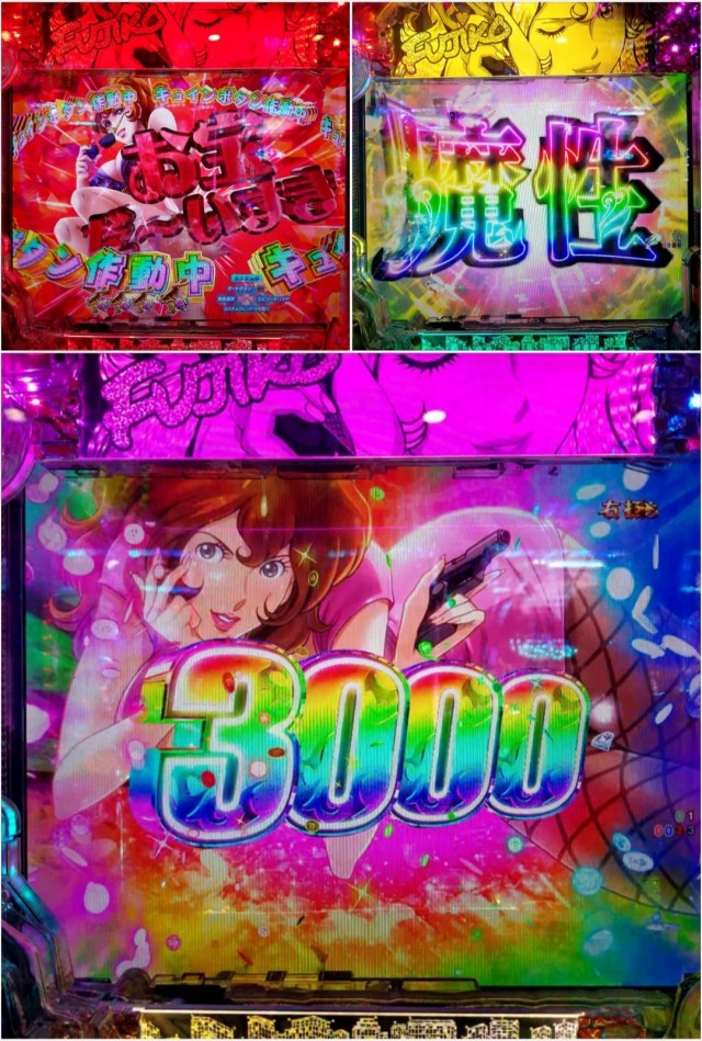 『Pルパン三世 ONE COLLECTION』にて、右打ち中に赤図柄揃いから虹演出、左右薔薇ランプ点灯から図柄揃い、胸にI LOVE YOUから虹テロップで大当り。そして赤台詞と共にキュインボタン作動中から虹・魔性出現で大当り、更に上乗せで大量出玉3000をゲットですねん!(モンちゃんさん)
