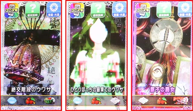 エンディング(通常エンディング・TRUEエンディング共通)中のレア役成立時は、サブ液晶に出現するカードで設定を示唆する。