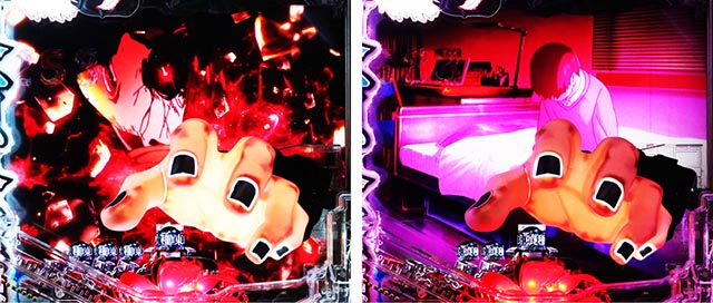 LT突入か否かのチャレンジ演出は2種類。「亜門突破チャレンジ」は亜門を倒すことができれば成功で、デバイス出現時に金木の「あなたもだ!」というセリフがあればRUSH突入濃厚です。「一発告知チャレンジ」は役物が落下すればRUSH突入。役物落下のタイミングは無数にあるので、一瞬たりとも気が抜けません!
