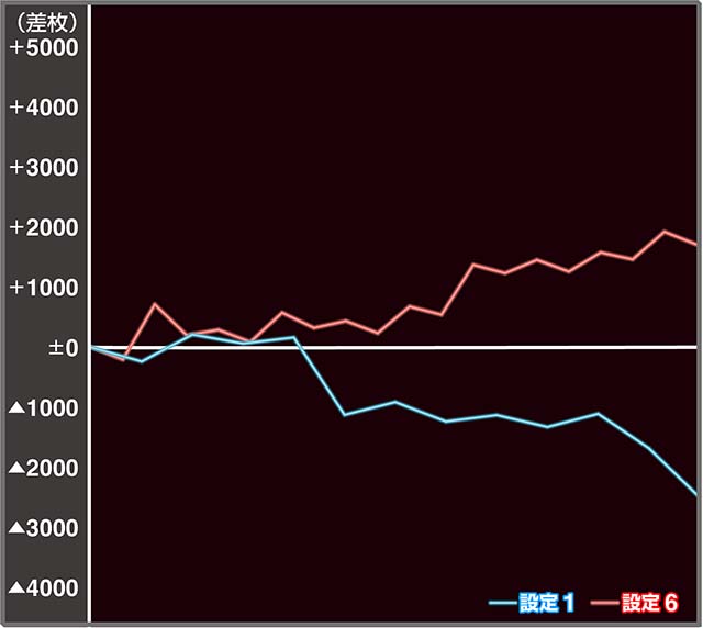 続いてスランプグラフ。明暗くっきりという感じですが、実は設定6もATをあまりうまく伸ばせていません。