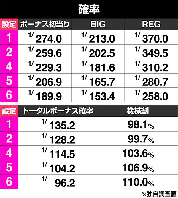 本来なら設定差まとめとして本記事があるのだが、これまでのところ、初当り確率のみしか判明しておらず、詳しく解説することが出来ない。