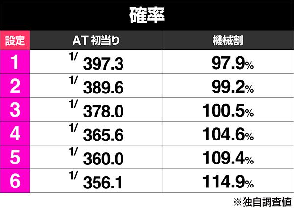 AT初当りに関しては1/397.3~1/356.1。設定差としてはそれほど大きくないのでプレイする際は頭の中に入れておこう。
