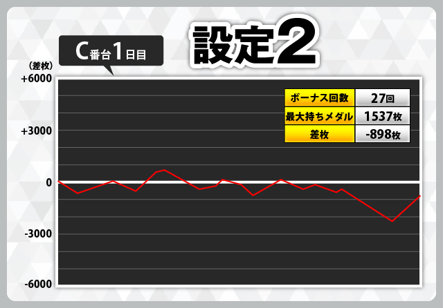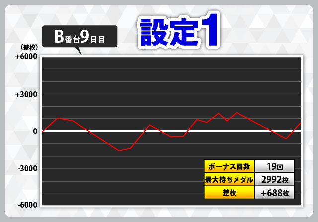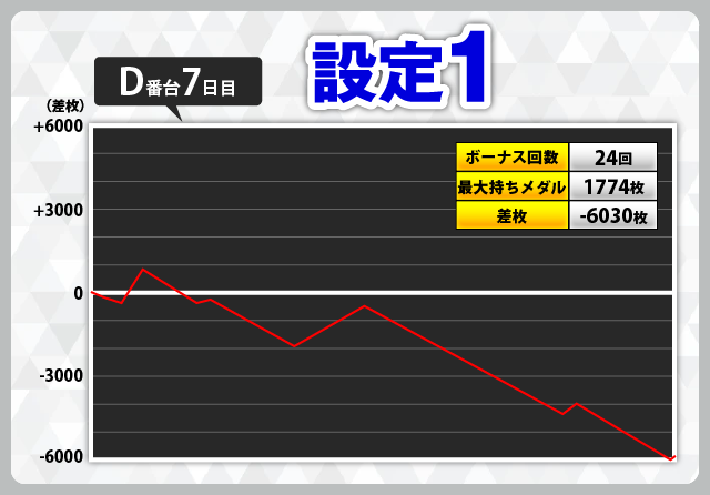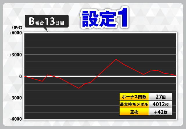 | 1 | +6912枚(設定6) | −6981枚(設定2) |