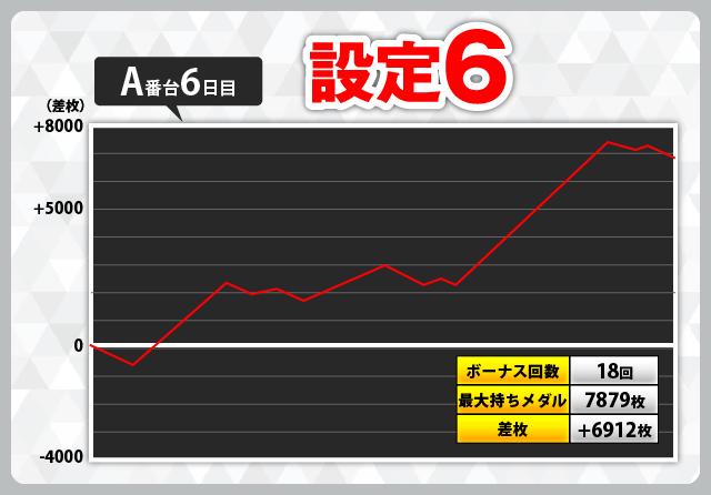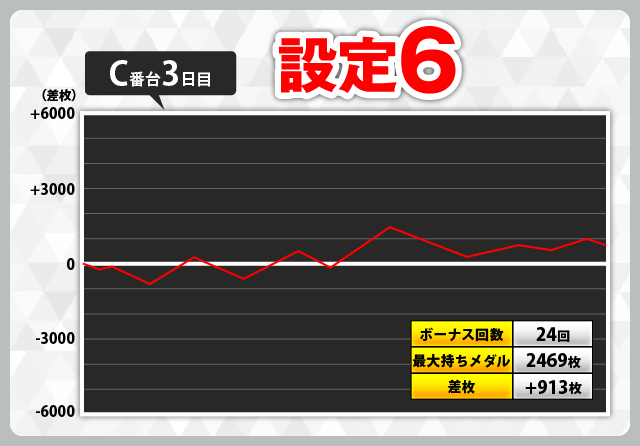 3台使用された設定6は、導入初日のA番台が+4296枚、3日目のC番台が+913枚、6日目のA番台が+6912枚と、3台すべてがプラスになっていました。