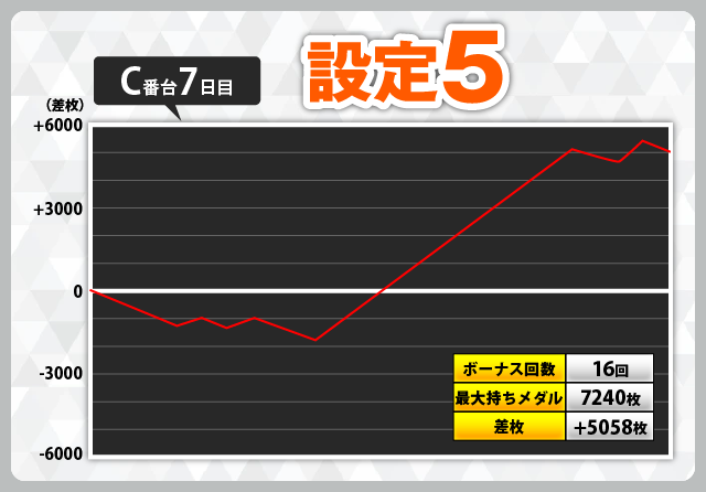 また、設定5も2台使用されてるのですが、こちらも2日目D番台が+2982枚、7日目C番台+5058枚と、2台ともに大幅なプラスとなっていて、設定5・6の高設定はかなり安定していると言えそうです。