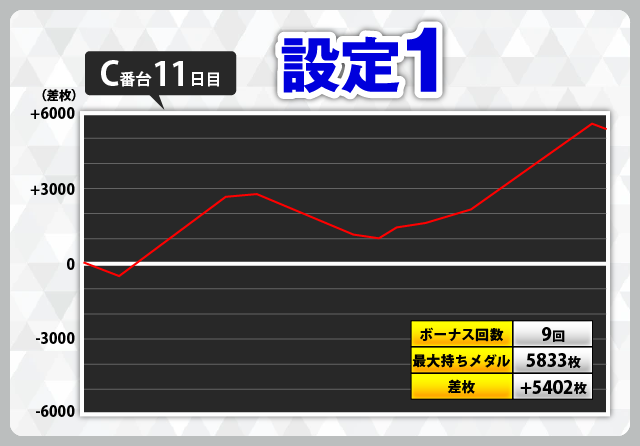 他にも8日目B番台(設定2)は最大3876枚獲得、最終的に+2282枚。10日目B番台(設定1)で最大7462枚を獲得し、最終的に+2302枚、11日目のC番台(設定1)は最大5833枚獲得し、最終的に+5402枚と、設定1・2でも大きく伸びるATが頻繁に目撃できました。