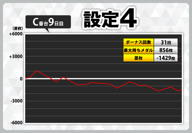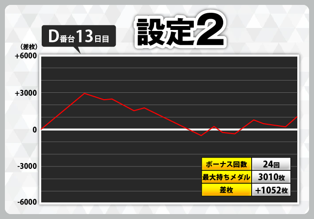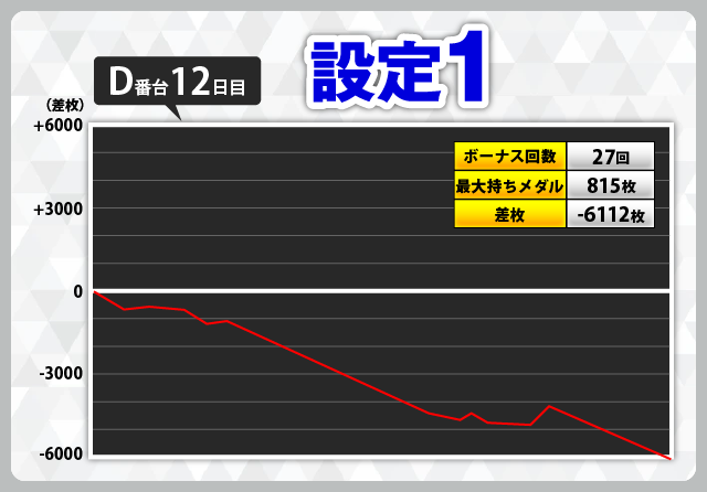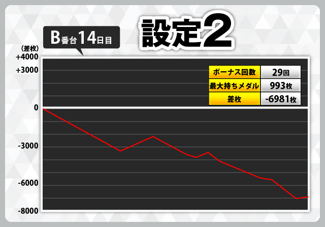 前述の通り低設定でも夢のある台だと思いますが、11日目のD番台(設定1)-5460枚、12日目のD番台(設定1)-6112枚、14日目のB番台(設定2)-6981枚のように、低設定は何もできないまま大きな負けを記録することもあります。設定推測をしっかりと行ないながらの実戦は忘れないようにしてください。