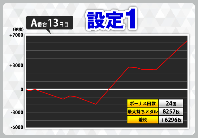 まず2週目の注目は13日目のA番台で、最大8257枚と今回1番の出玉を獲得。最終差枚でも+6296枚と設定1にもかかわらず大きな勝利を手にしています。