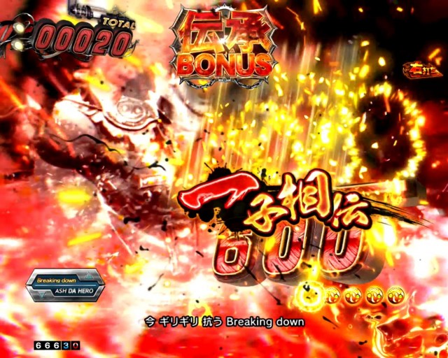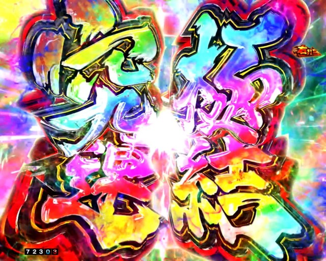 SP発展演出で北斗無双ギミックが完全落下したあと、Shockギミックでキャラが表示されると当リーチに進み、トータル信頼度は9割超。チャンスアップは赤テロップ以外なら全て図柄揃いが待ち受ける。