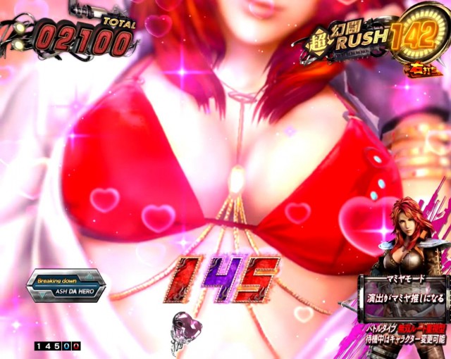 本機で勝利を得るために欠かせないのがラッキートリガー(LT)の超・幻闘RUSH発動。175回転かつ連チャン率約84%かつ出玉がオール10R1500個(払い出し、以下同)となり、現役機の中でもトップクラスの出玉パワーを誇る。