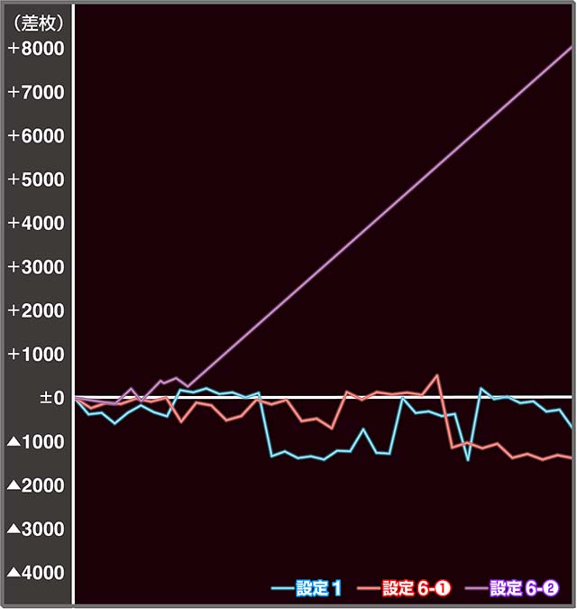 今回採取した実戦データは3本。設定1を1本、設定6を2本採取しました。この内、突出しているのが設定6-②のスランプグラフ。