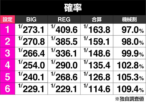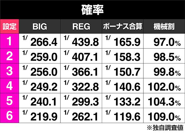| 機種 | ボーナス合算確率 | 最大放出数 |