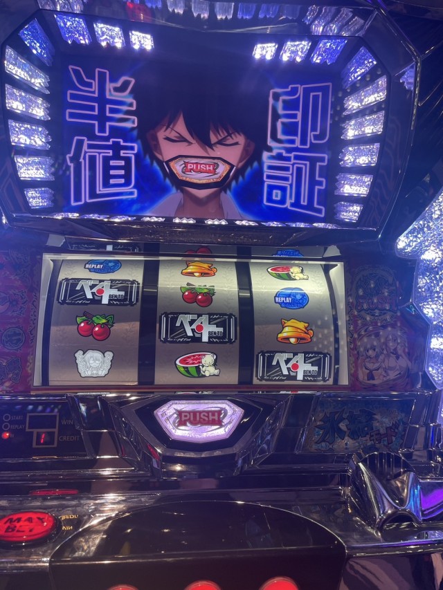 ここまでは上々。このあとはART機の『ベン・トー』を打ち、早々に中段チェリー。氷結モードもありつつ持ちメダルは3500枚ほどに!