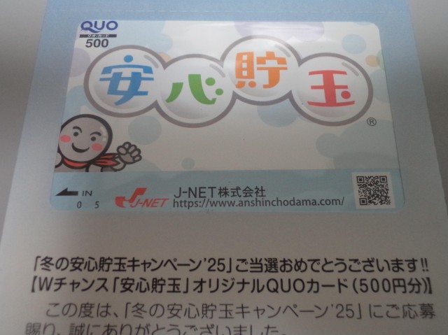 去年の年末、マイホールのすみっこに「冬の安心貯玉キャンペーン」なる懸賞が置いてあり、アンケートを書いて応募したところ全国で400名しか当たらないQUOカードに当選しました!! ハガキだったので投資→切手代、回収→500円分QUOカードといったところでしょうか(笑)。みなさーん!! 期待値はホールの隅々にまでありますよー!!(S@mpleさん)