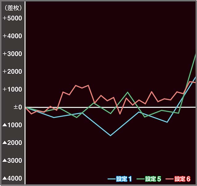 ヒキ次第では偶数設定でも、奇数設定のように跳ねたグラフになると思いますが、基本的にはしっかりと設定をアピールしてくる印象を受けました。