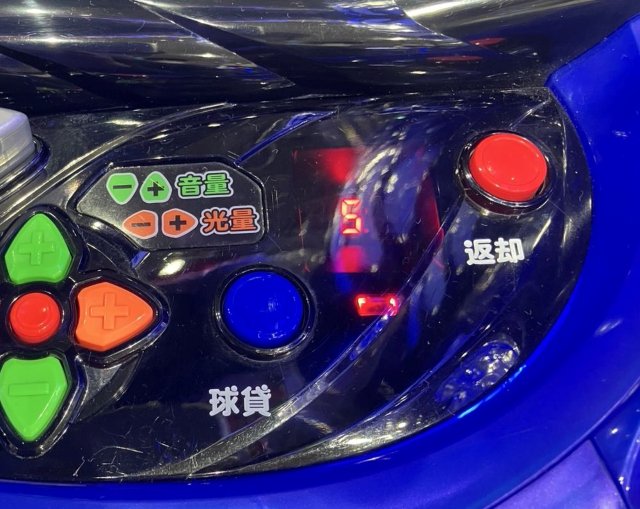To play pachinko, first insert a bill into the indicated machine. The remaining credit will appear on the digital display of the upper tray. Next, press the "球貸" = "ball rental" button. On a 4yen pachinko machine, this will dispense 125 pachinko balls (equivalent to 500 yen) into the upper tray.